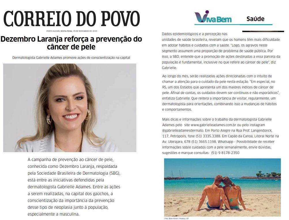 No mês de dezembro acontece a campanha da Sociedade Brasileira de Dermatologia de prevenção ao câncer da pele, o Dezembro Laranja. A Dra. Gabrielle Adames foi convidada a falar sobre o assunto e da importância da prevenção ao Jornal Correio do Povo. Ela lembrou que o RS é o estado com maior incidência de câncer da pele e alertou sobre os danos solares à pele.